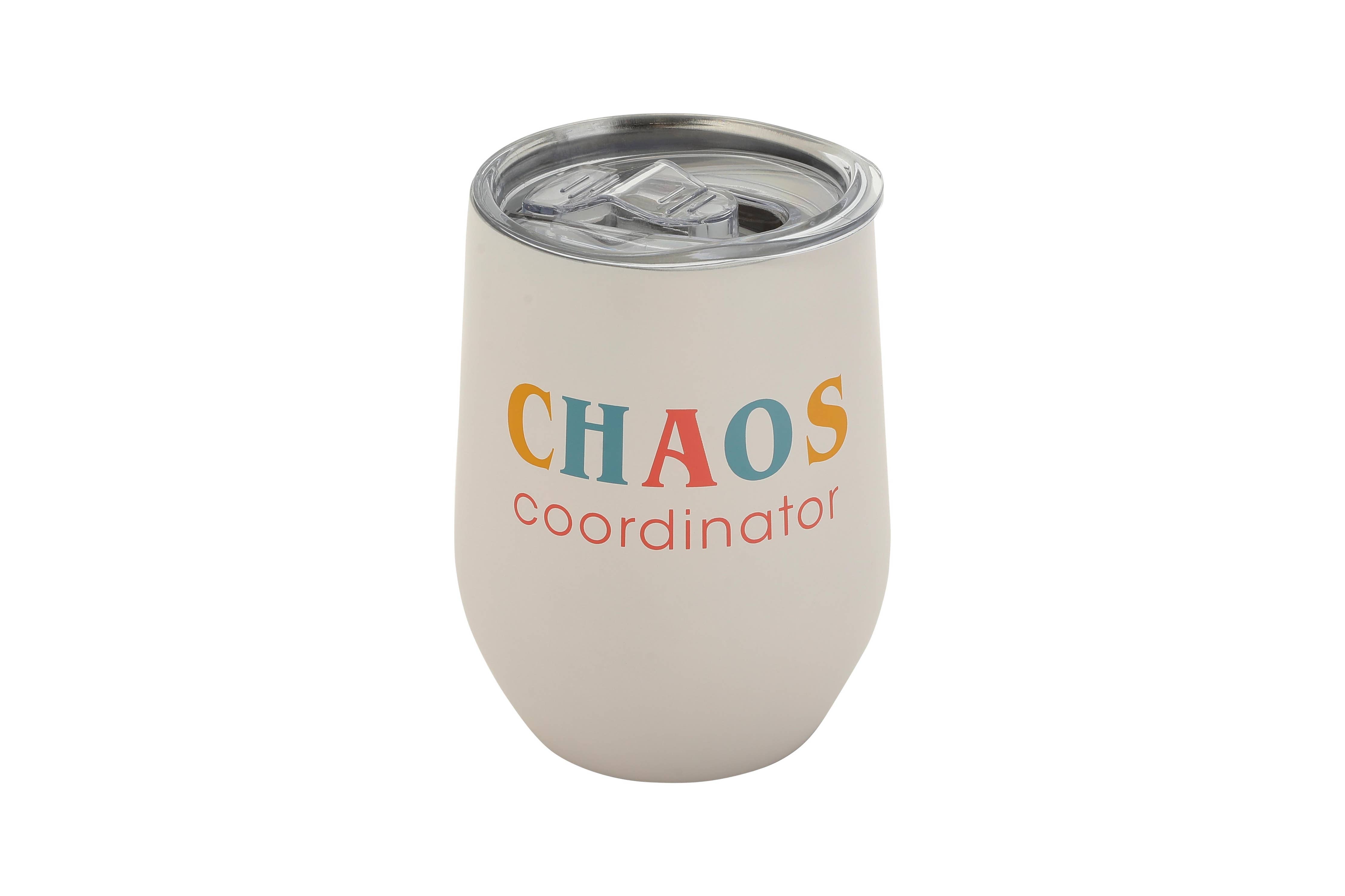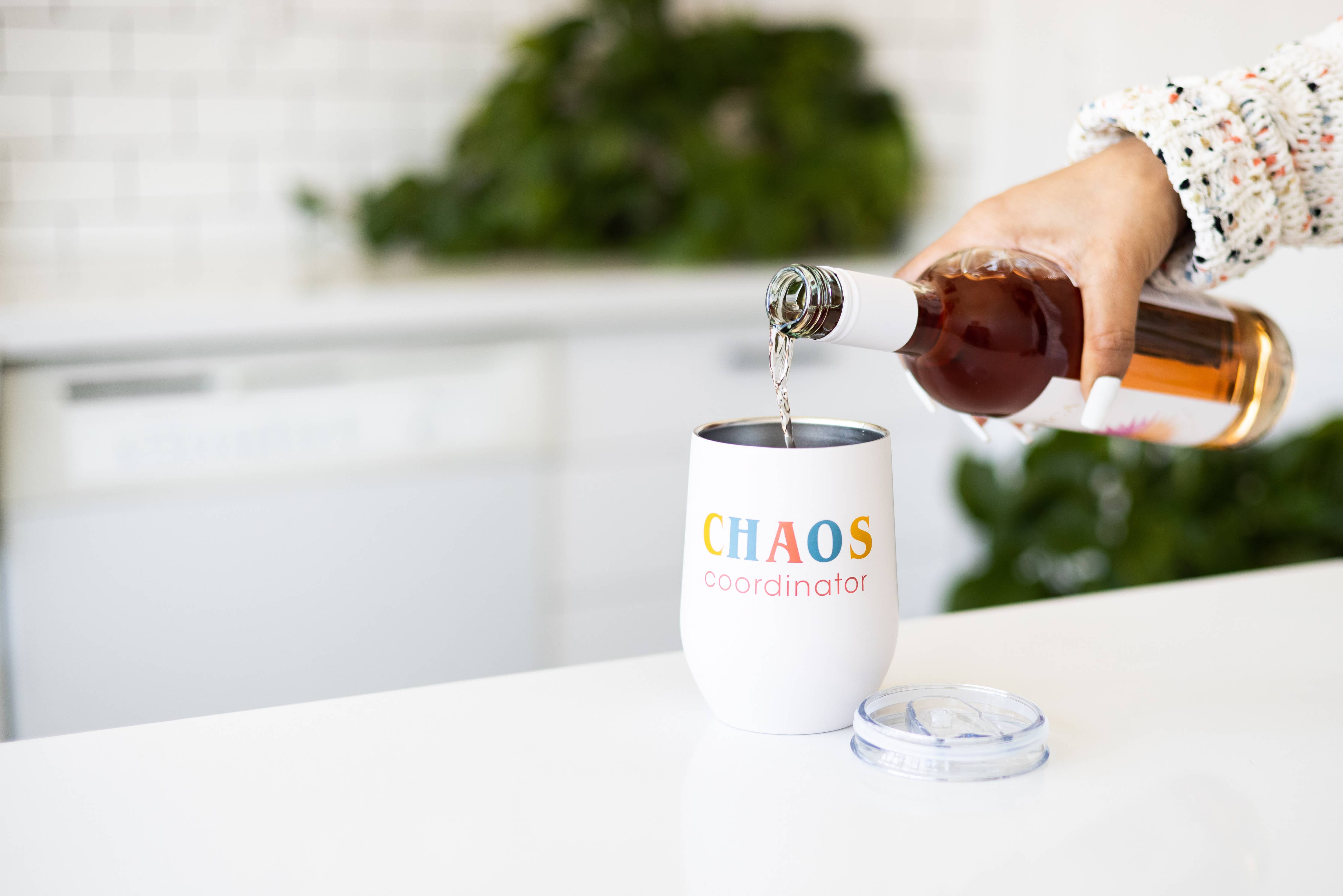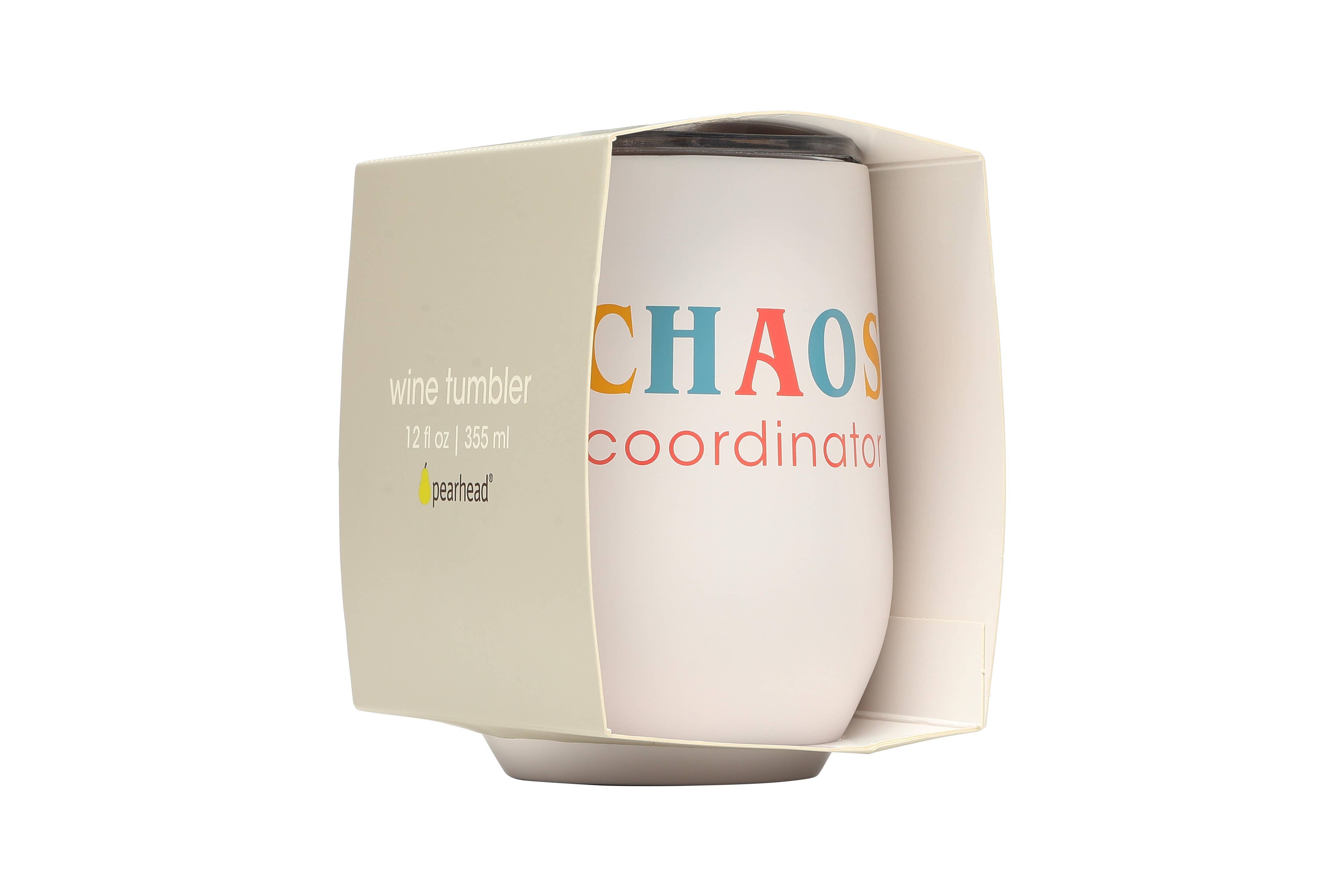 Includes one double walled stainless steel stemless wine travel tumbler with splash resistant, press-in lid with sliding sipper closure, BPA free; pastel pink matte tumbler with an bold “chaos coordinator” multicolor print