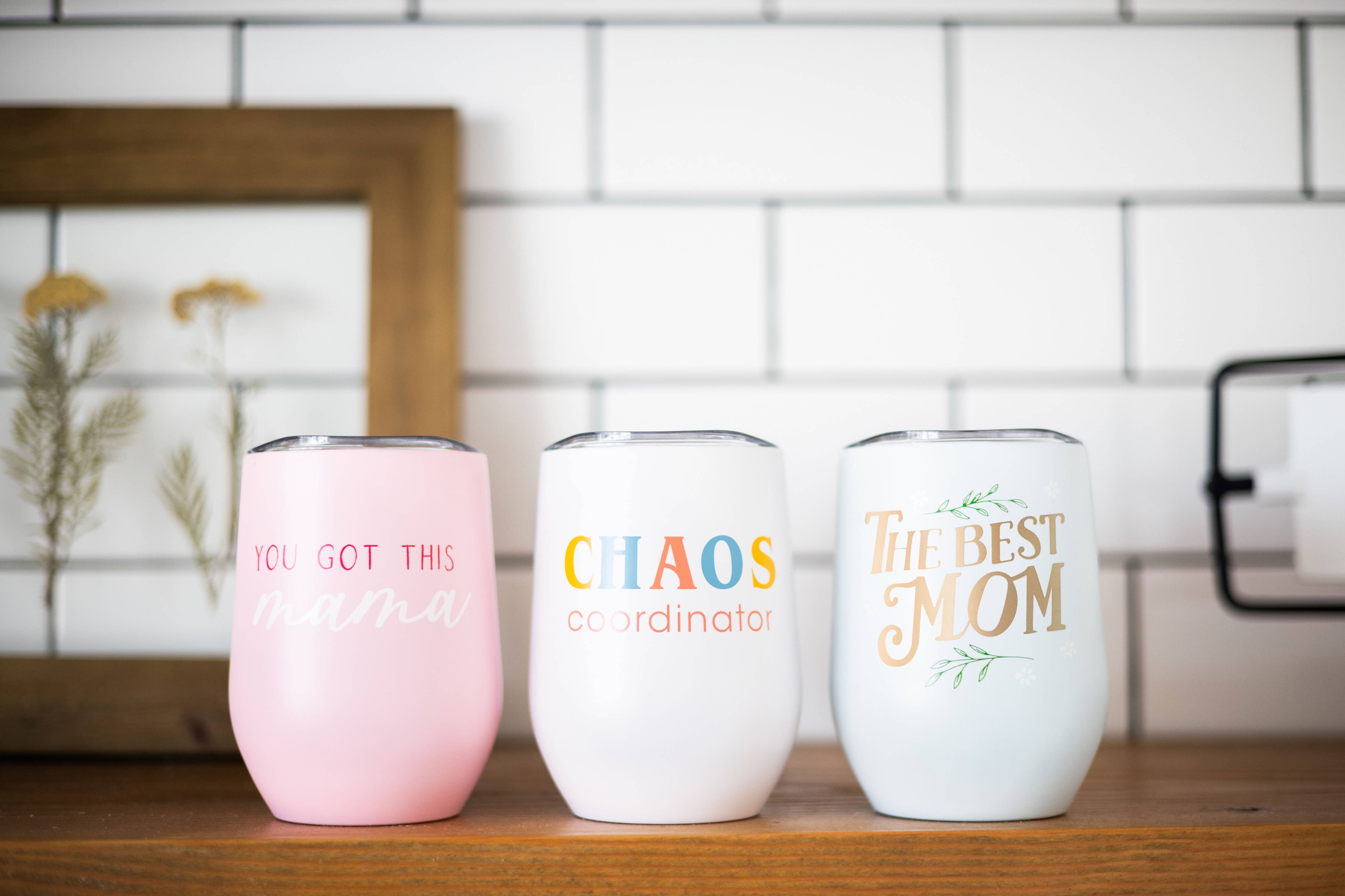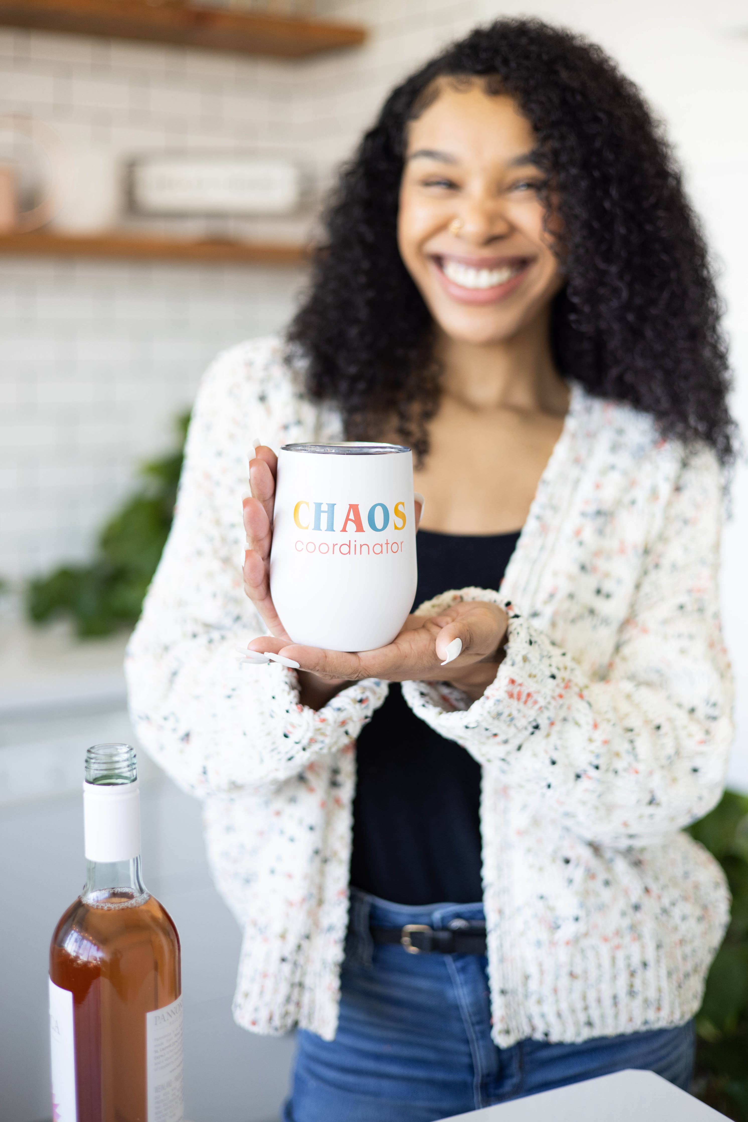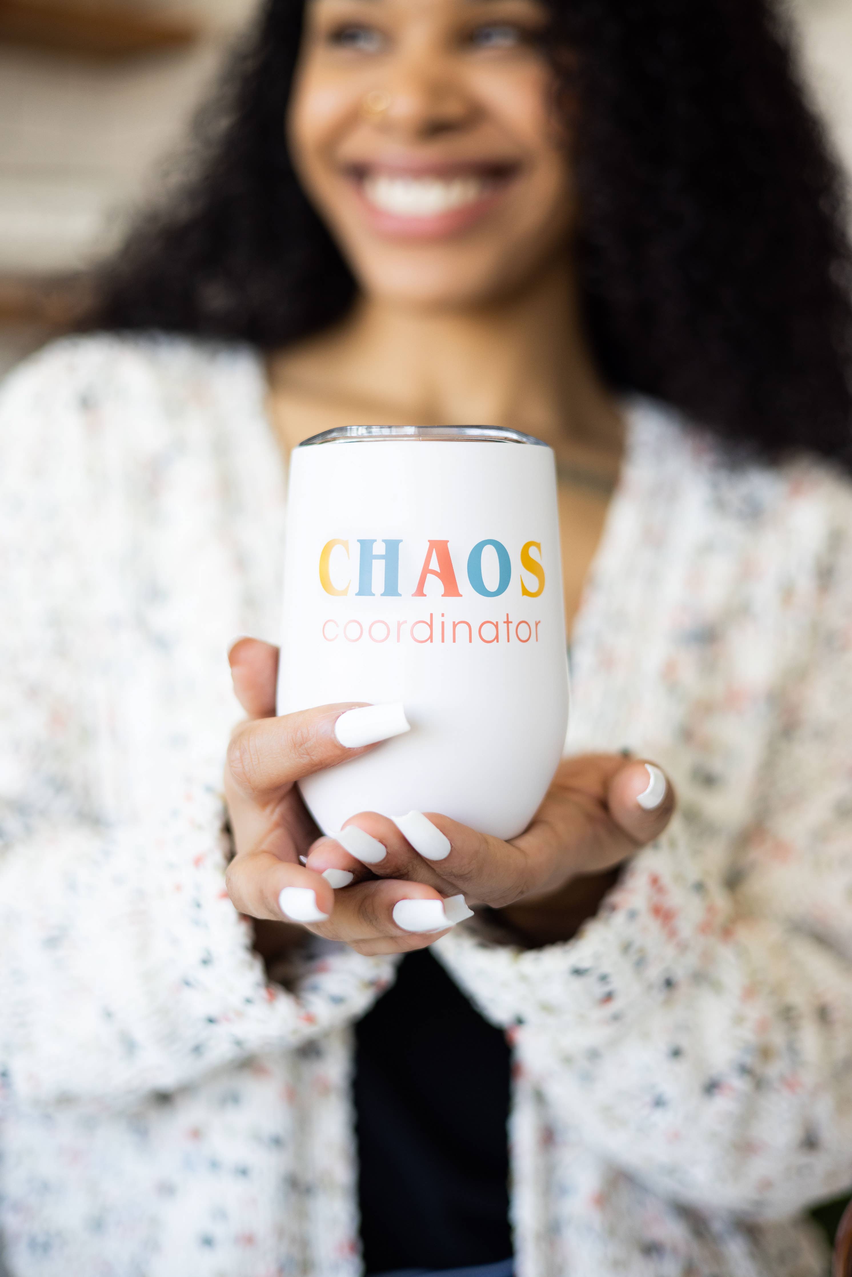 Includes one double walled stainless steel stemless wine travel tumbler with splash resistant, press-in lid with sliding sipper closure, BPA free; pastel pink matte tumbler with an bold “chaos coordinator” multicolor print