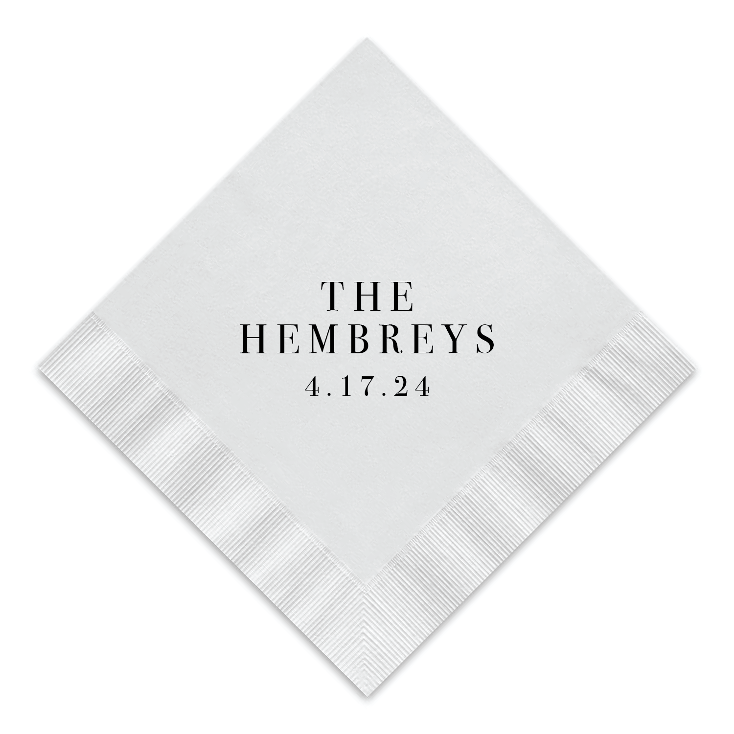 Personalized napkins are a fun way to impress your guests at your reception! We offer a variety of custom designs and a wide range of napkin and ink or foil colors to match any decor. Choice of diamond or square napkin orientation. Bordered edge. Sold in sets of 100.