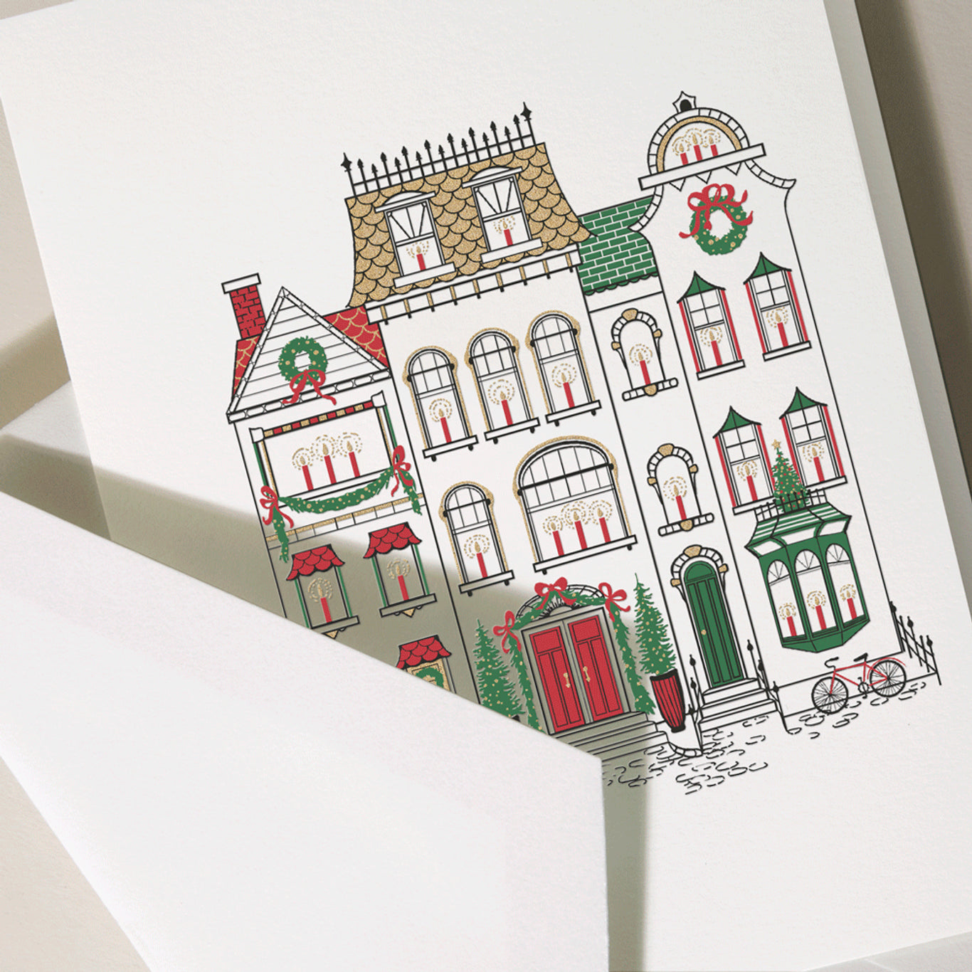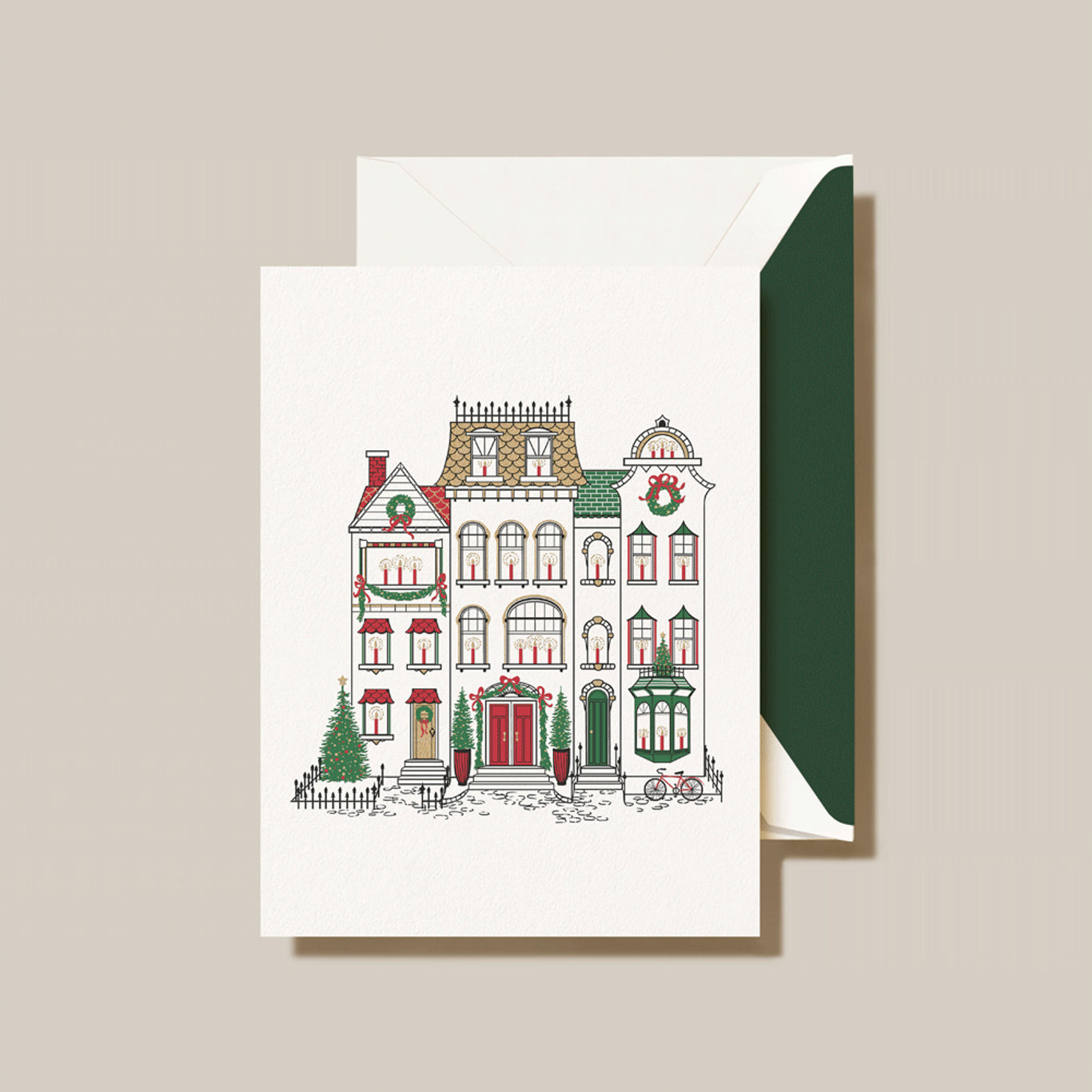 Is there anything better than the holidays in the city? This Cozy Brownstones holiday card evokes the magic of the season with its darling neighborhood scene–a city block alive with the spirit of the season. Shimmering candlelit windows and garland galore, this majestic moment is one we've captured for good reason, and we're eager for you to share it with your loved ones this season. The card opens to read "From home to home and heart to heart, from one place to another, the warmth and joy of Christmas brings us closer to each other. -Emily Matthews" printed in hunter green. The matching envelope is lined in hunter green.