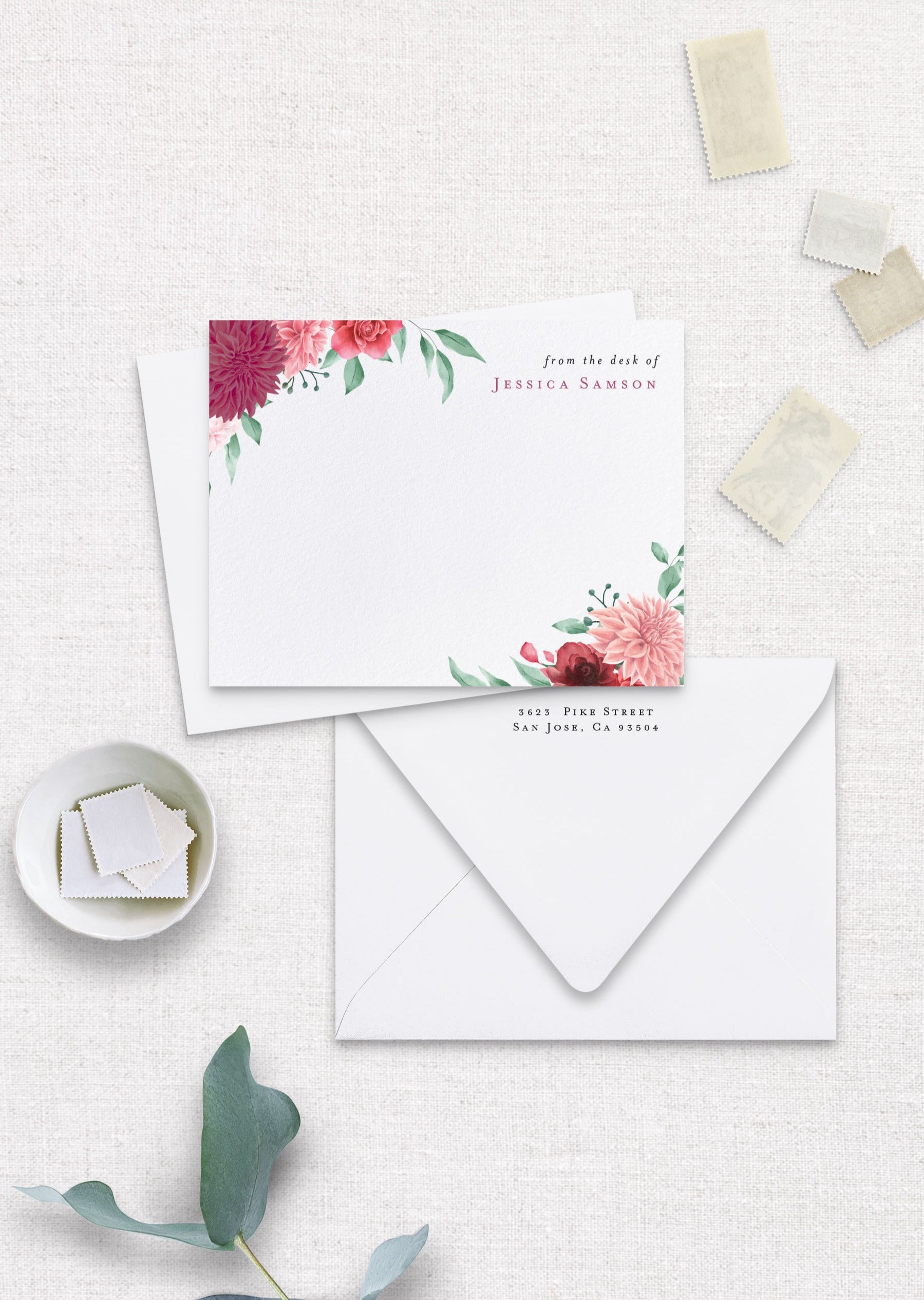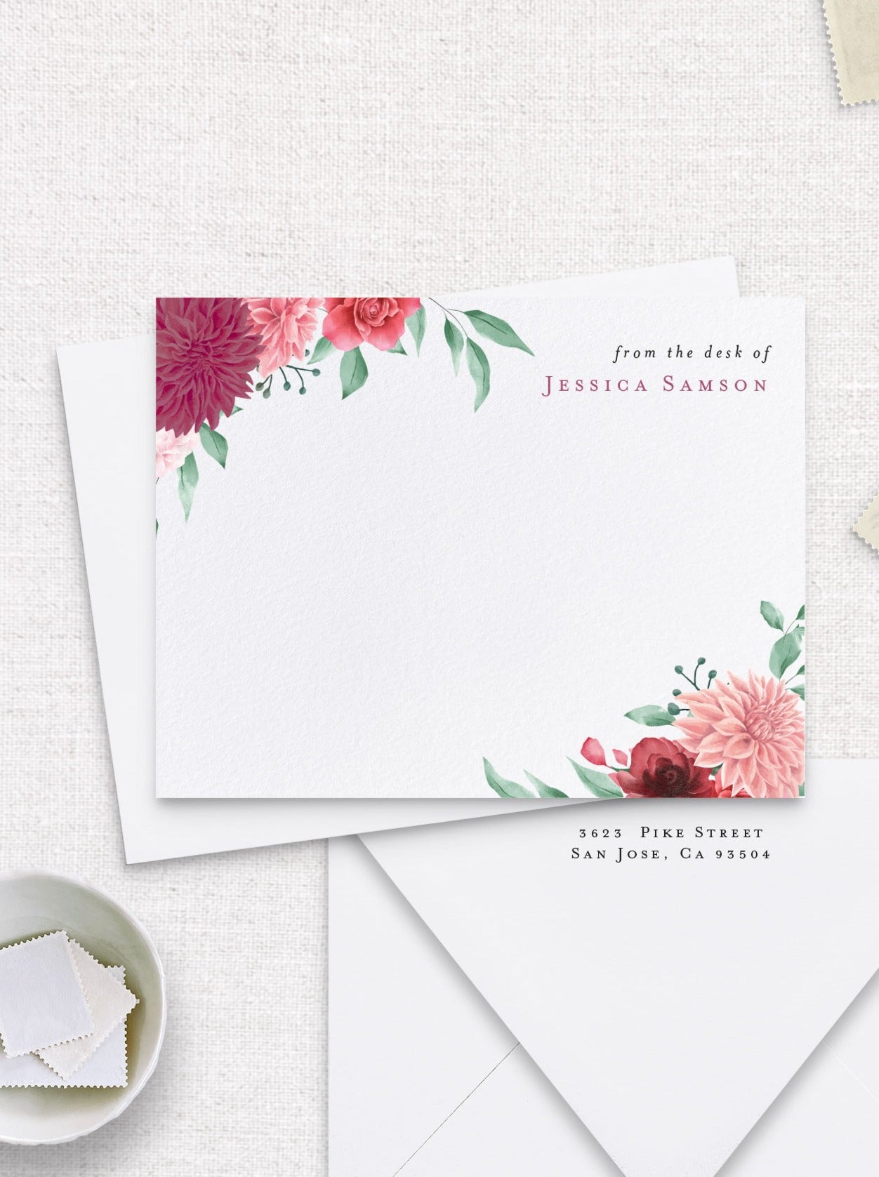 Our Dahlia Note Cards feature burgundy and blush florals. These A2 (4.25x5.5) cards are flat printed on 100# cardstock paper and includes envelopes with return address printing. Text colors and envelope color are customizable.