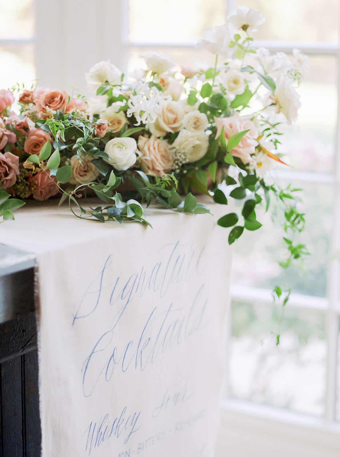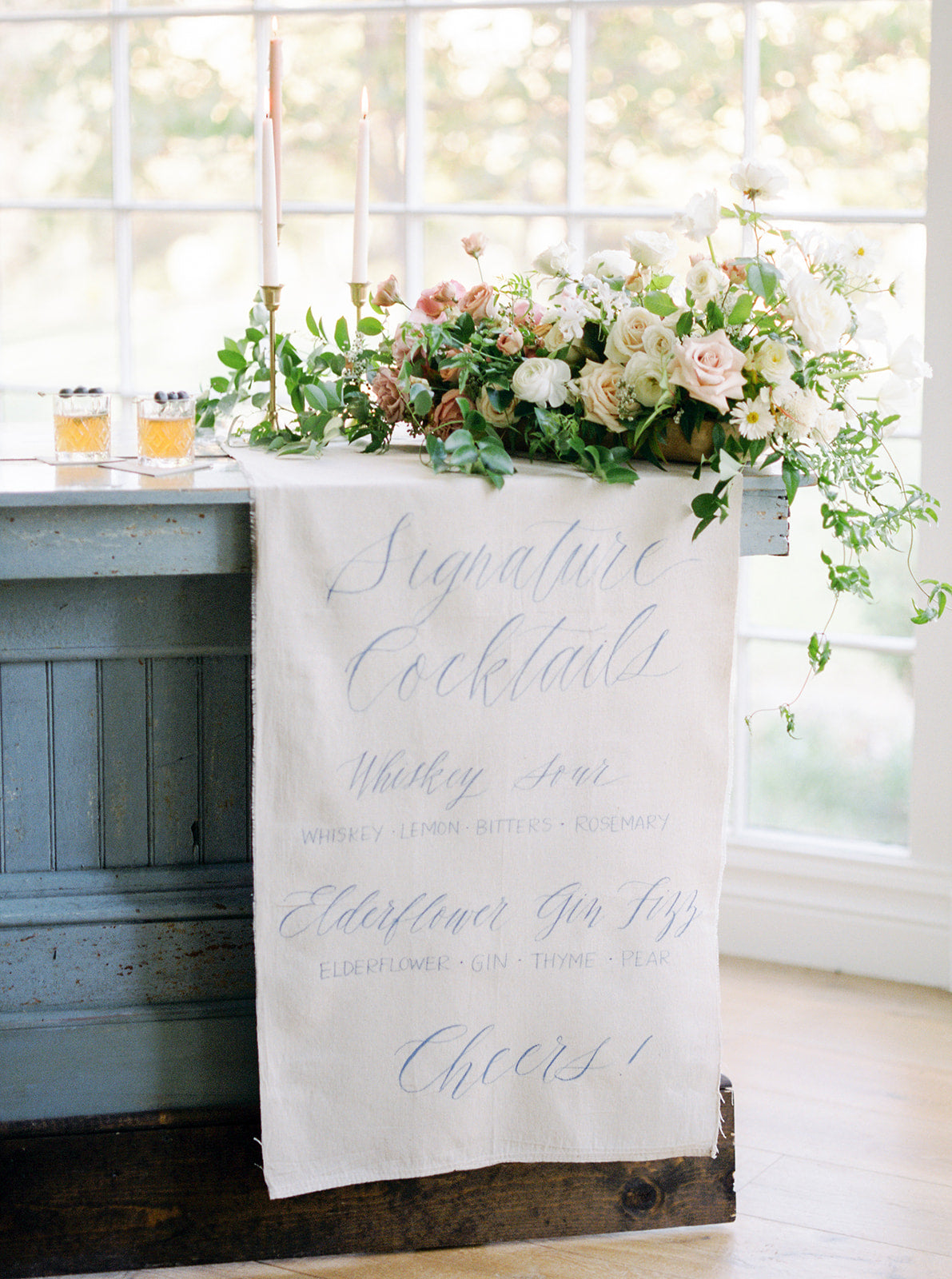 Whether draped on the bar or hung on a stand, our Linen Cocktail Sign adapts effortlessly to various display settings. However, if it will be hung, we recommend an indoor setting or somewhere where it's not windy. We can also add grommets to the corners for added stability. We recommend steaming or ironing before displaying.